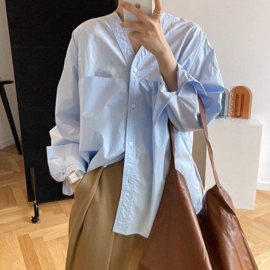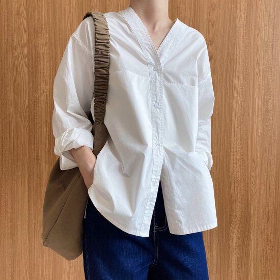 長袖シャツ レディース Vネック ノーカラー ブラウス シャツ ポケット 切り替え フロントボタン ゆったり オーバーサイズ レトロ スキッパーシャツ シンプル ユニセックス 2color おしゃれ