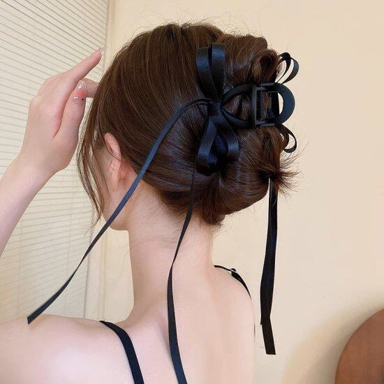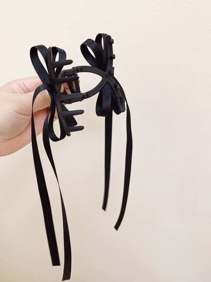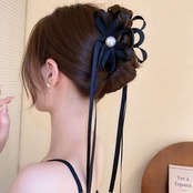 ヘアクリップ レディース リボン ヘアアクセサリー ロング パール バレッタ 黒 ブラック レトロ クラシカル きれいめ エレガント ガーリー フェミニン 結婚式 披露宴 パーティー おしゃれ
