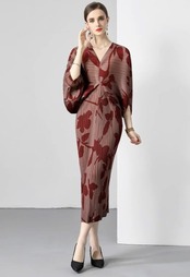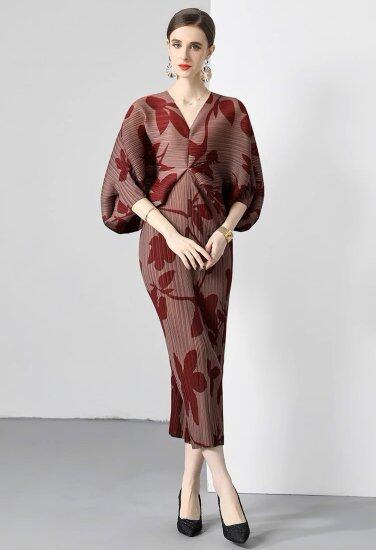 ロングワンピース レディース プリーツ 花柄 Vネック 五分袖 ボリューム袖 ドルマンスリーブ タイト ボタニカル フラワー ロング マキシ 4color 個性的 エレガント パーティー おしゃれ