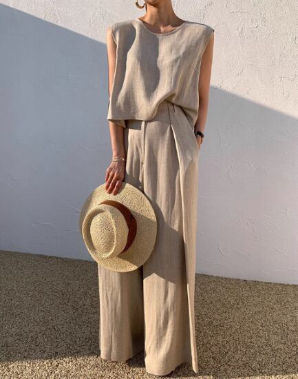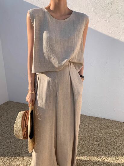 ナチュラルな風合いのノースリーブセットアップ。