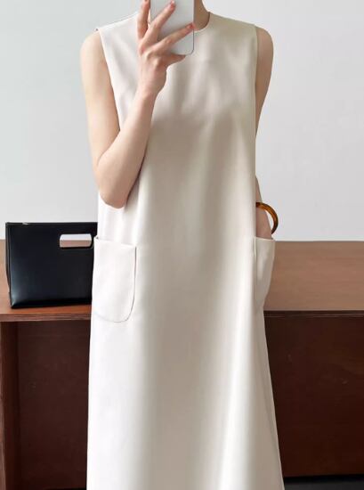 ノースリーブワンピース レディース ワンピース ロングワンピース ラウンドネック シンプル 無地 ロング丈 ポケット ゆったり 体型カバー カジュアル お出かけ おしゃれ 春夏 きれいめ エレガント