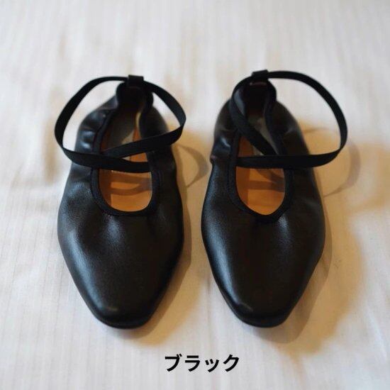 本物のバレエシューズのようなクロスストラップのフラットシューズ。