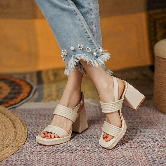 バックストラップサンダル レディース オープントゥ チャンキーヒール 太ヒール ハイヒール 10cmヒール スクエアトゥ フェイクレザー レトロ クラシカル 2color エレガント 脚長 おしゃれ