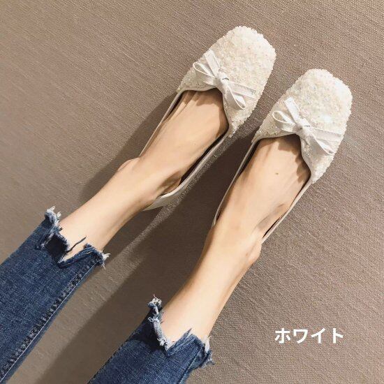フラットパンプス レディース リボン スパンコール スクエアトゥ ローヒール グリッター キラキラ フラットシューズ レトロ かわいい ガーリー 2color エレガント パーティー おしゃれ