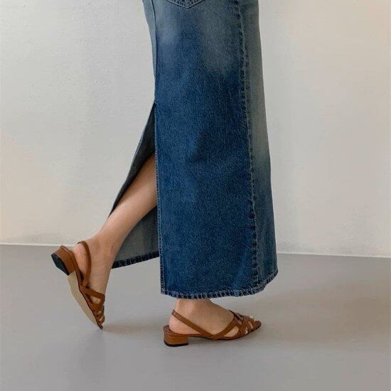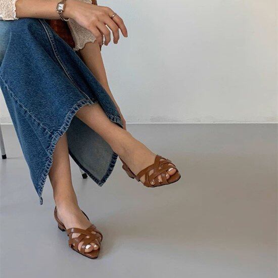 編み目のようなデザインで足元に抜け感を作るバックストラップサンダル。