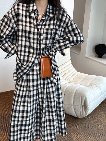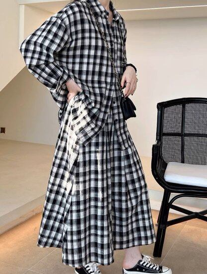 セットアップ レディース チェック柄 上下セット シャツ ブラウス 長袖 ロングスカート フレアスカート レトロ クラシカル ゆったり カジュアル 2点セット ツーピース おでかけ おしゃれ