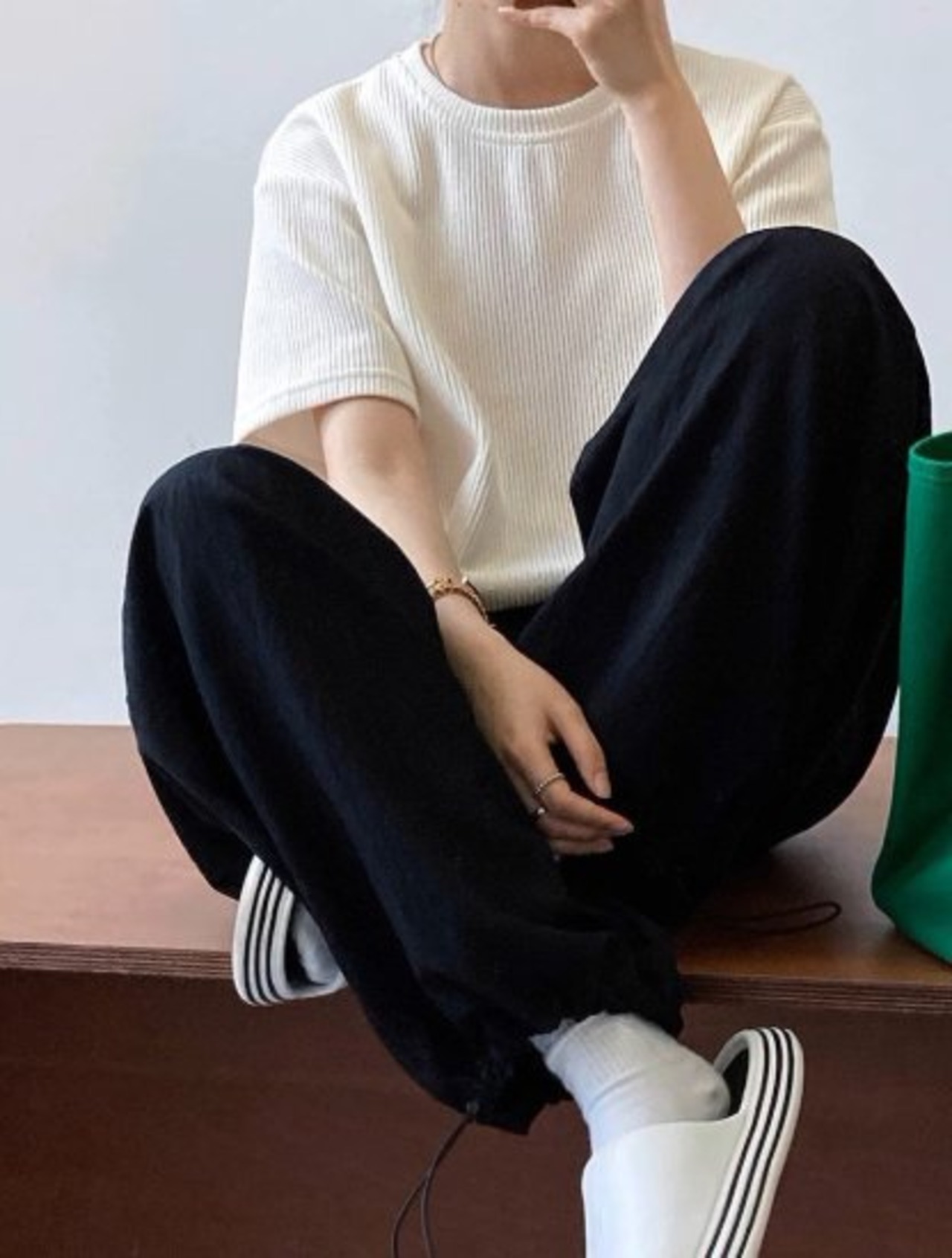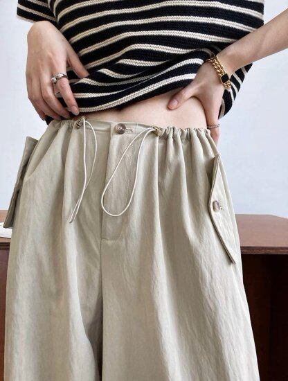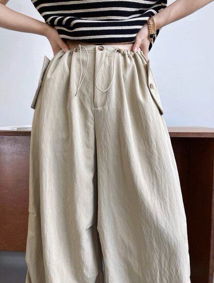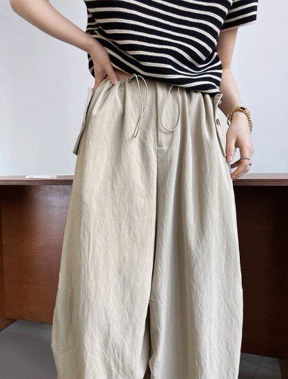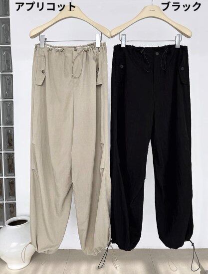 ウエストと裾がドローストリングでシルエットを変えれらえるカジュアルパンツ。