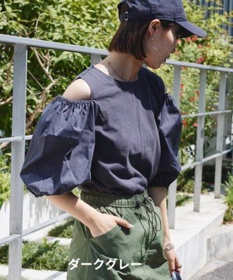 Tシャツ レディース ボリューム袖 肩出し パフスリーブ ブラウス 半袖 五分袖 カットソー ラウンドネック ボリューム カットワーク 個性的 2color かわいい ガーリー カジュアル おしゃれ