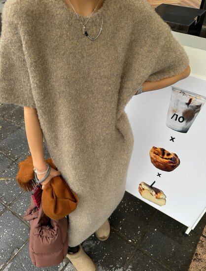 モコモコとした素材感がかわいい半袖ニットワンピース。