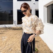 立体的なフラワーモチーフが大人かわいい長袖プルオーバー。