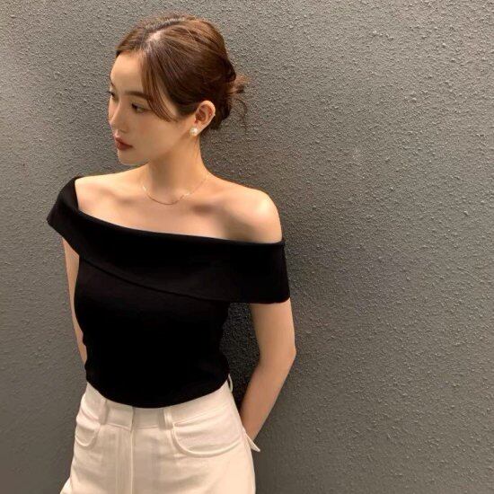 オフショルダーシャツ レディース Tシャツ カットソー 半袖 肩出し スリム タイト ボーダー 無地 レトロ 3color きれいめ セクシー エレガント ガーリー カジュアル トップス おしゃれ