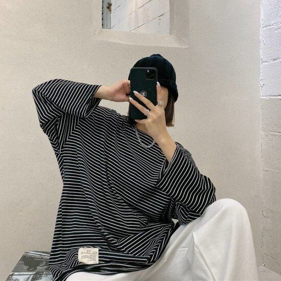 リラクシーな雰囲気のボーダーロングTシャツ。