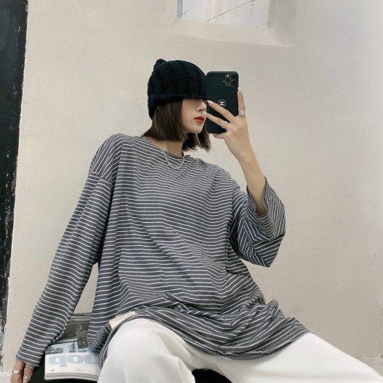 ボーダーTシャツ レディース ロングTシャツ カットソー 長袖 プルオーバー ラウンドネック ラグランスリーブ ルーズ オーバーサイズ レトロ 3color ボーダー ロング丈 カジュアル おしゃれ