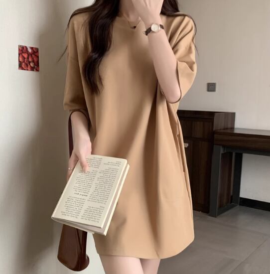 五分袖Tシャツ レディース トップス カットソー プルオーバー ラウンドネック ミドル丈 チュニック シンプル 無地 ゆったり ルーズフィット 大きいサイズ カジュアル お出かけ おしゃれ 春夏