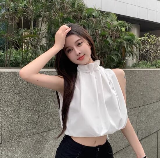シフォンブラウス レディース トップス ブラウス シャツ ハイネック ノースリーブ ショート丈 クロップド丈 フリルネック ゆったり ルーズ カジュアル きれいめ お出掛け おしゃれ エレガント