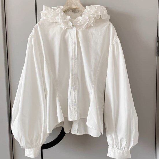 フリルブラウス レディース ボリューム袖 フード付き フリル ランタンスリーブ ブラウス シャツ パフスリーブ レトロ 個性的 かわいい 華やか ガーリー カジュアル 白シャツ コットン おしゃれ