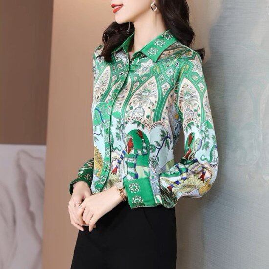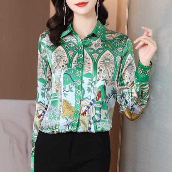 プリントブラウス レディース 総柄 長袖 シャツ ブラウス 花柄 シャツカラー ポロ襟 レトロ 光沢 シルク調 クラシカル サイケ 緑 グリーン きれいめ カジュアル 個性的 おでかけ おしゃれ