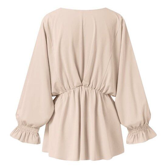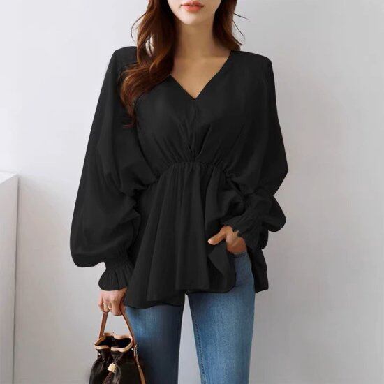 Vネックブラウス レディース 長袖ブラウス ランタンスリーブ ペプラム シャーリング ロング シャツ パフスリーブ チュニック フリル レトロ 3color かわいいガーリー きれいめ おしゃれ