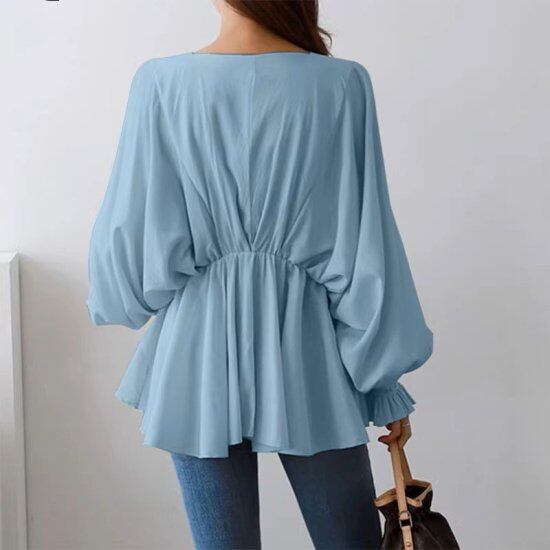 流れるようなドレープが美しいランタンスリーブブラウス。