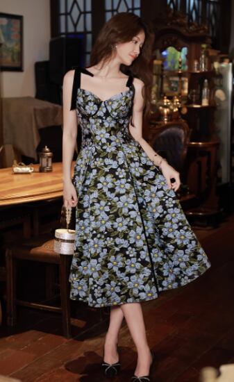 花柄ワンピース レディース ワンピース キャミソールワンピース ミドル丈ワンピース 総柄 フラワー 肩リボン ハイウエスト Aラインスカート キュート 可愛い カジュアル きれいめ おしゃれ 女性