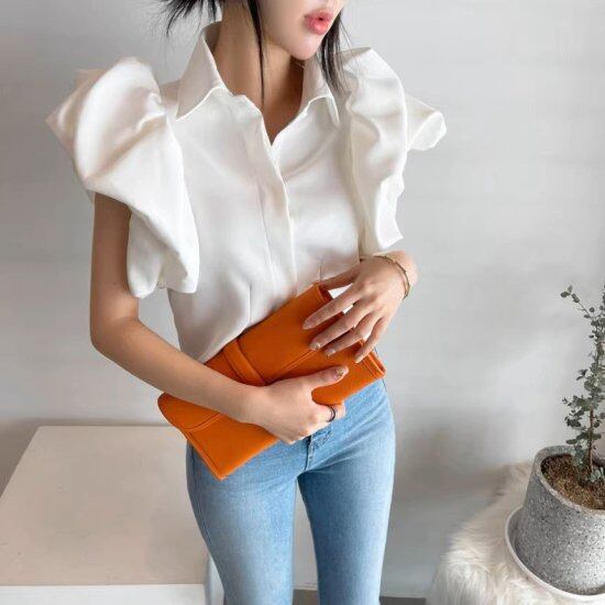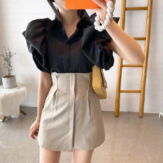 半袖ブラウス レディース ボリューム袖 デザインスリーブ シャツカラー ポロ襟 ボリュームショルダー レトロ クラシカル 2color きれいめ エレガント カジュアル パーティー シャツ おしゃれ