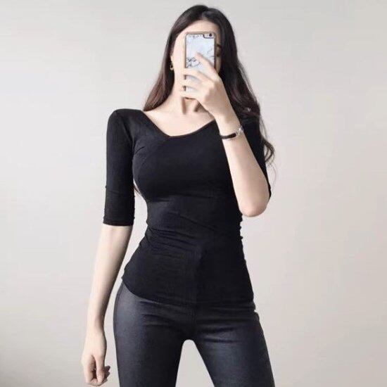 半袖Tシャツ レディース Vネック 変形 五分袖 カットソー プルオーバー スリム タイト 背中あき Tシャツ 2color レトロ セクシー ガーリー カジュアル インナー 無地 おしゃれ
