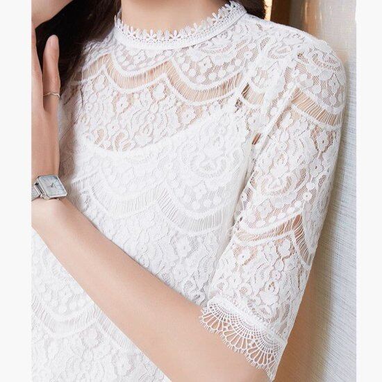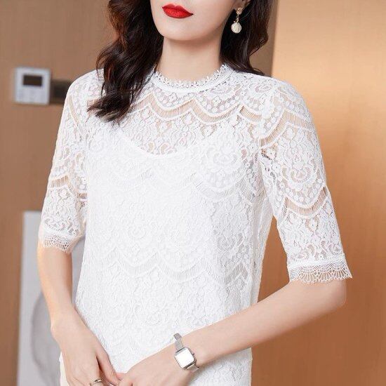 レースブラウス レディース レースプルオーバー 半袖 ブラウス シャツ プルオーバー 五分袖 ラウンドネック ハイネック シアー シースルー レトロ クラシカル エレガント 2color おしゃれ