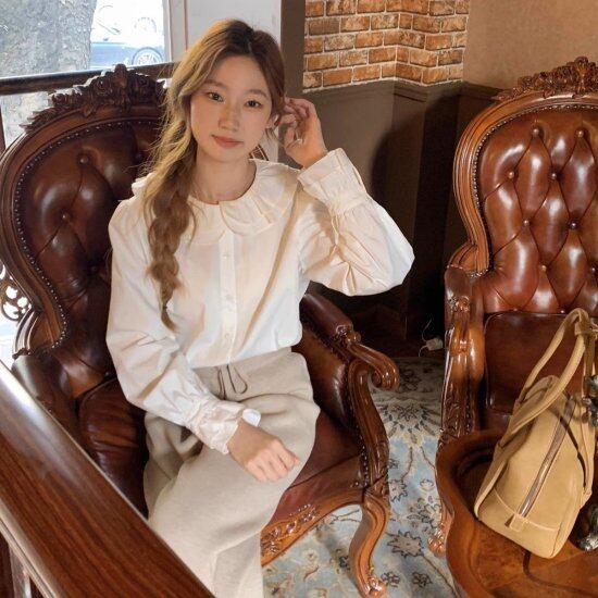 長袖ブラウス レディース フリルカラー シャツ ブラウス 長袖 フリル コットン 無地 シンプル レトロ クラシカル かわいい ガーリー フェミニン カジュアル エレガント おでかけ おしゃれ