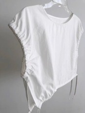 クロップドシャツ レディース ドローストリング ノースリーブ フレンチスリーブ ラウンドネック ショート丈 ベスト ブラウス プルオーバー 無地 個性的 カジュアル モード ストリート おしゃれ