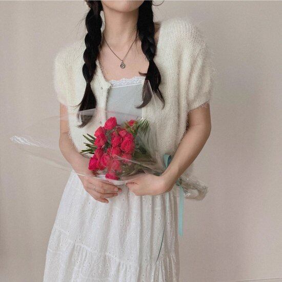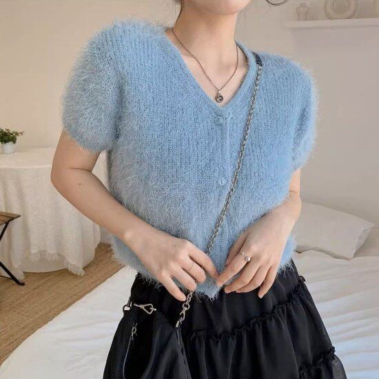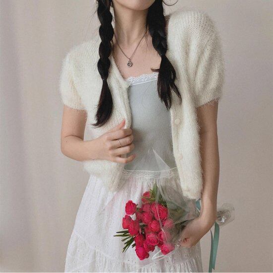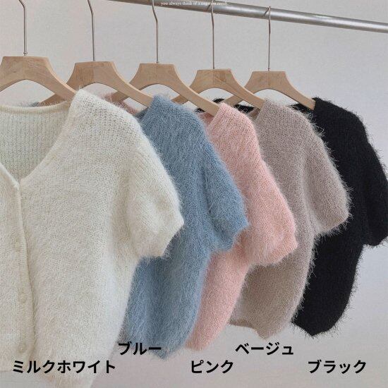 半袖ニット レディース 半袖カーディガン ニット ショート丈 フロントボタン プルオーバー ふわふわ ラウンドネック レトロ クラシカル 5color かわいい ガーリー カジュアル おしゃれ