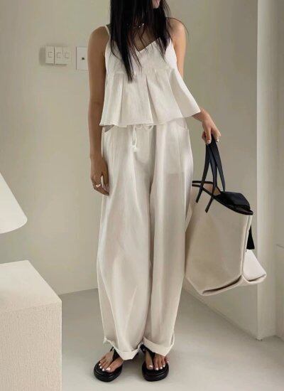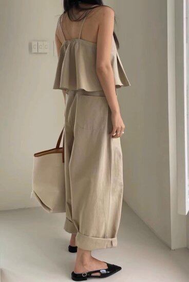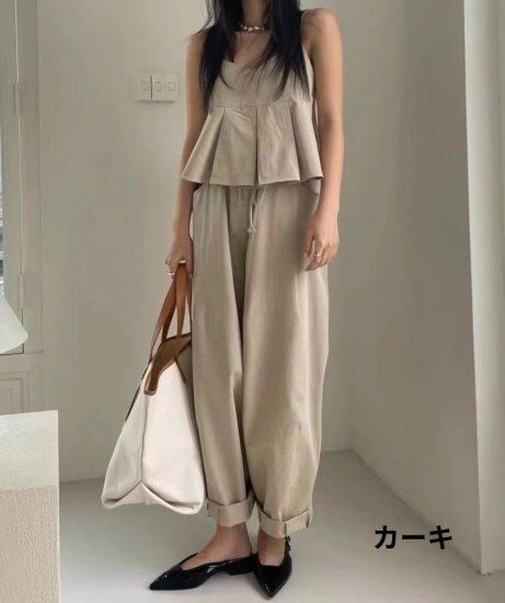 セットアップ レディース キャミソール ノースリーブ プリーツ ペプラム ワイドパンツ ハイウエスト イージーパンツ カジュアルパンツ レトロ 3color カジュアル リゾート 夏 おしゃれ
