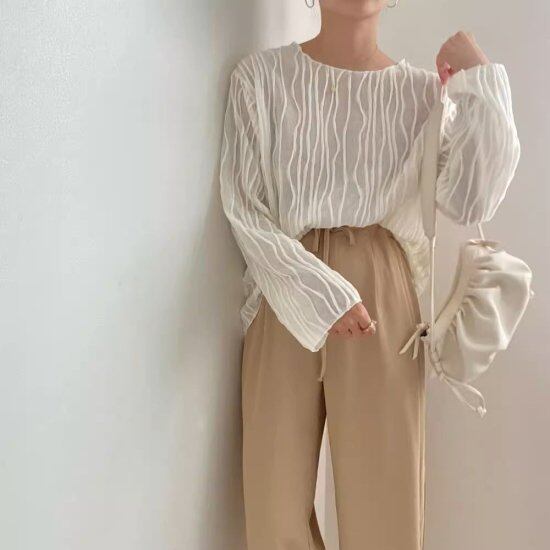 長袖シャツ レディース ブラウス プルオーバー カットソー ウェーブ ストライプ ラウンドネック シアー ゆったり ルーズ レトロ クラシカル エレガント カジュアル 2color 長袖 おしゃれ