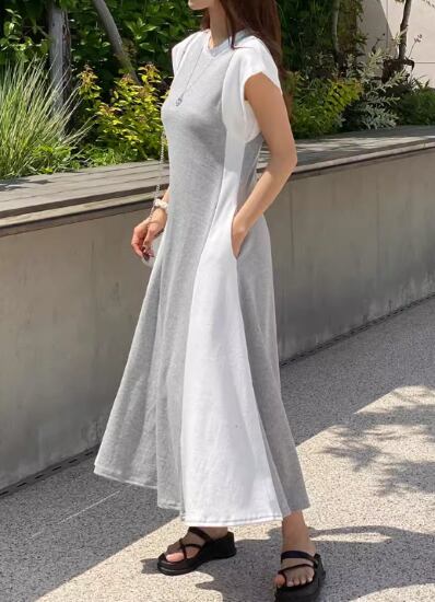 ロングワンピース レディース ワンピース ノースリーブワンピース Aラインスカート フレアスカート ラウンドネック 配色デザイン カラーブロック 切り替え シンプル 無地 カジュアル お出かけ 春夏