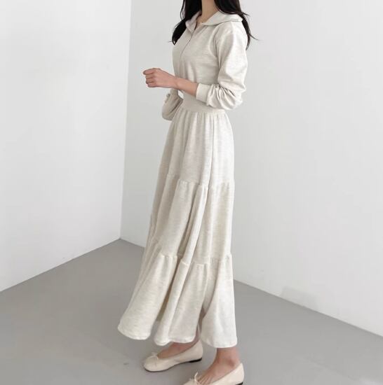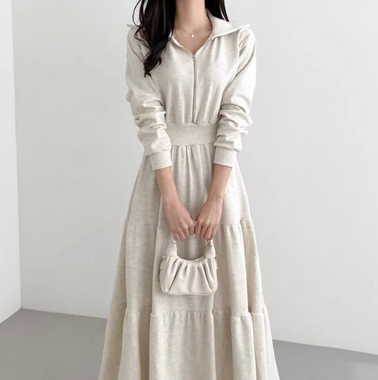 ロングワンピース レディース ワンピース 長袖ワンピース ジップアップ Aラインスカート フレアスカート ハイウエスト ウエストマーク カジュアル お出かけ おしゃれ ロング丈 女性 ファッション