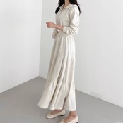 Aラインスカートが女性らしいシルエットのロングワンピース。