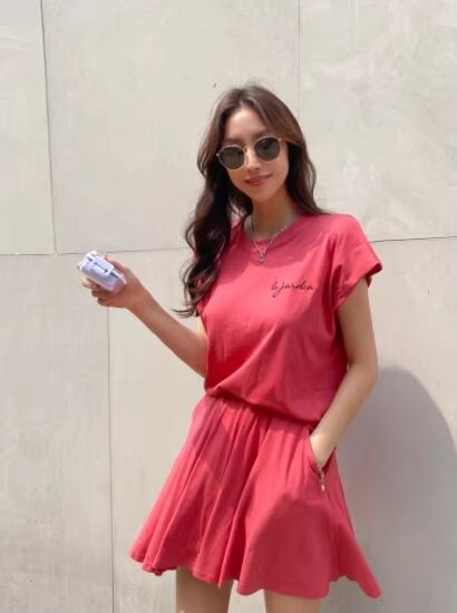 半袖トップスとスカート風のショートパンツのセットアップ。