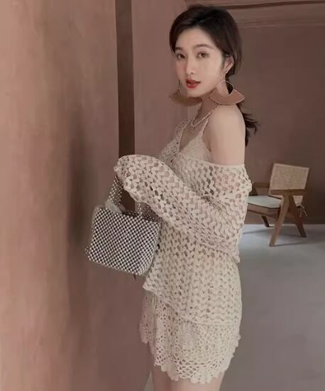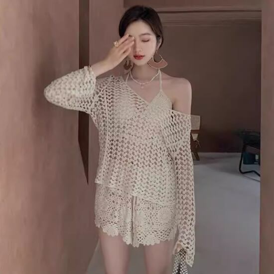 ビキニ レディース 水着 3点セット スリーピース ホルターネック クロシェ編み ショートパンツ カバーアップ ナチュラル UV対策 日焼け防止 体型カバー スイムウェア ビーチウェア 夏 海 プール