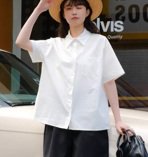 半袖シャツ レディース シャツ トップス ブラウス フロントボタン ポロ襟 襟あり シンプル 無地 定番 ベーシック カジュアル お出かけ おしゃれ きれいめ 春夏 ゆったり 白シャツ ホワイト 女性