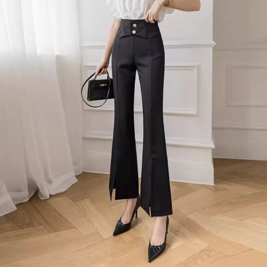 フレアパンツ レディース パンツ ボトムス ロングパンツ スーツパンツ スリット センターライン ボタン きれいめ エレガント スタイリッシュ カジュアル お出かけ おしゃれ スリムフィット 長ズボン