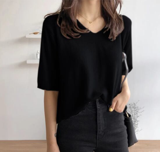 サマーセーター レディース トップス カットソー セーター 半袖 五分袖 ゆったり ルーズ プルオーバー Vネック シンプル 無地 ベーシック 定番 カジュアル お出かけ おしゃれ きれいめ 女性