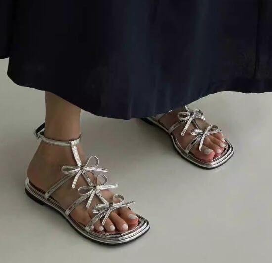 フラットサンダル レディース 靴 シューズ サンダル リボン オープントゥ アンクルストラップ 歩きやすい 疲れにくい 黒 ブラック シルバー カジュアル お出かけ おしゃれ 女性 ファッション